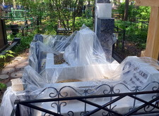 К сожалению, в самый разгар работы нас застал дождь. Так как реставрация требовала сухой погоды, то мы закрыли место захоронения плёнкой и покинули кладбище, отложив восстановление на несколько суток.